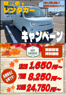 2025年11日13日11月のキャンペーン開催中です。 ホットガレージ北福島店ではレンタカーのキャンペーンが開催中です。 軽自動車1泊2日...
