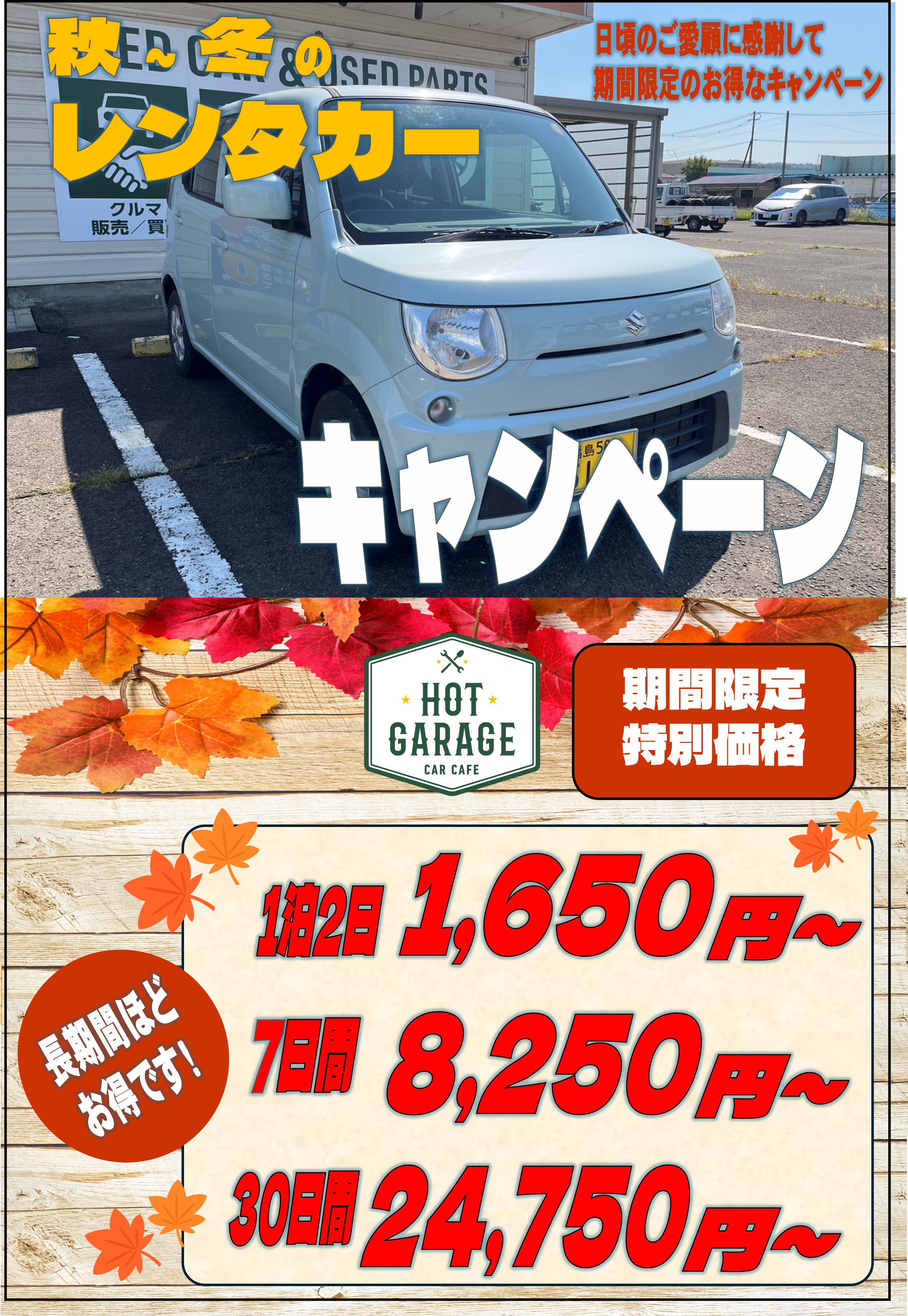 11月のキャンペーン開催中です。 ホットガレージ北福島店ではレンタカーのキャンペーンが開催中です。 軽自動車1泊2日で1650円~ 7日間で8250円~ 30日間で24750円~ となります。11/1~30までの期間中にレンタル開始または継続中のお客様に限ります。 よろしくお願いいたします。